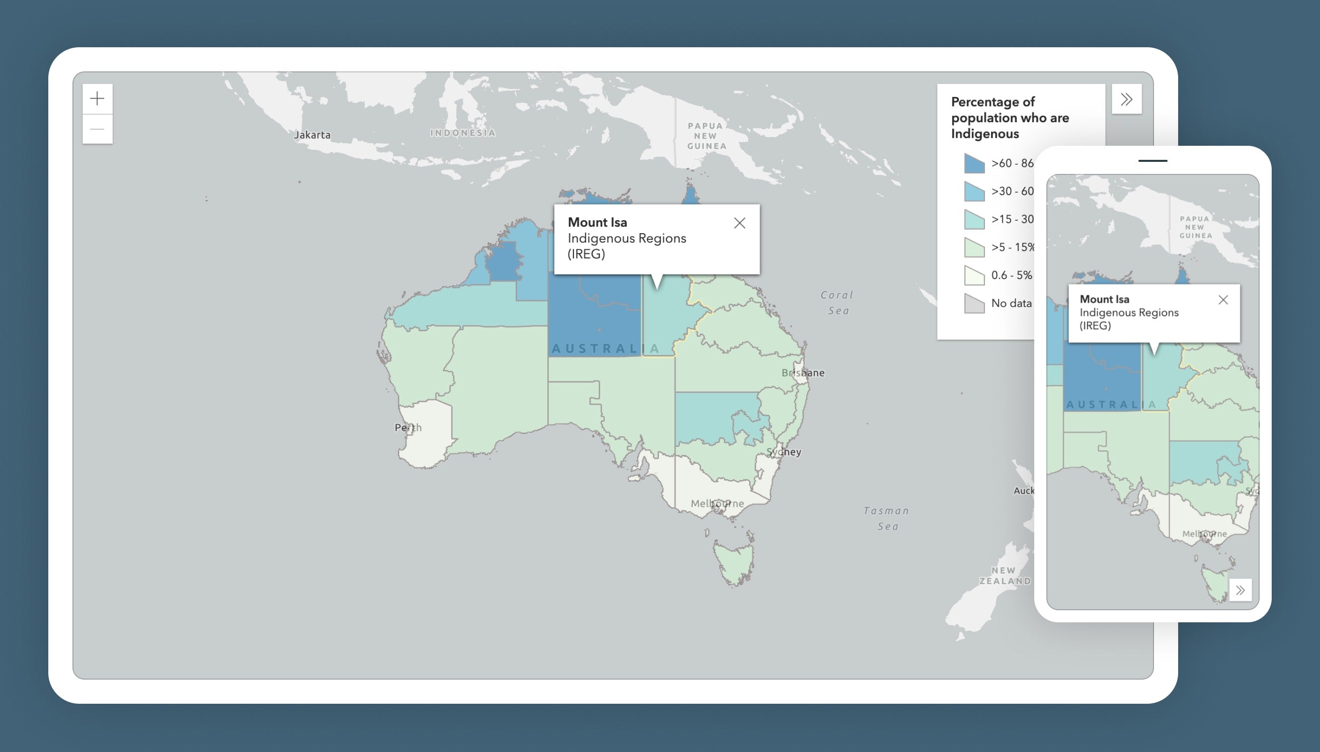 This can be achieved using data visualisation tools such as Tableau, AM Charts, ESRI Mapping software. The below example for the Australian Institute of Health and Welfare was produced using ESRI, and included accompanying infographics and statistics to support the map content. We then displayed several maps and infographics on a data-driven dashboard.