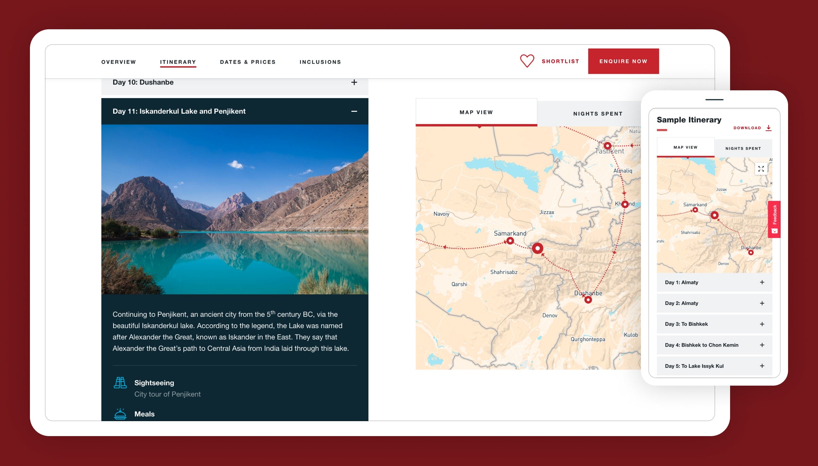 Here's another example implementation for Sundowners Overland. The 21 day journey through Central Asia is visually represented by the stylised map which remains in-view on the right-hand side of the screen. In this instance, the map is not interactive, but works to enhance and explain the journey visually rather than relying on reams of text to explain the journey.