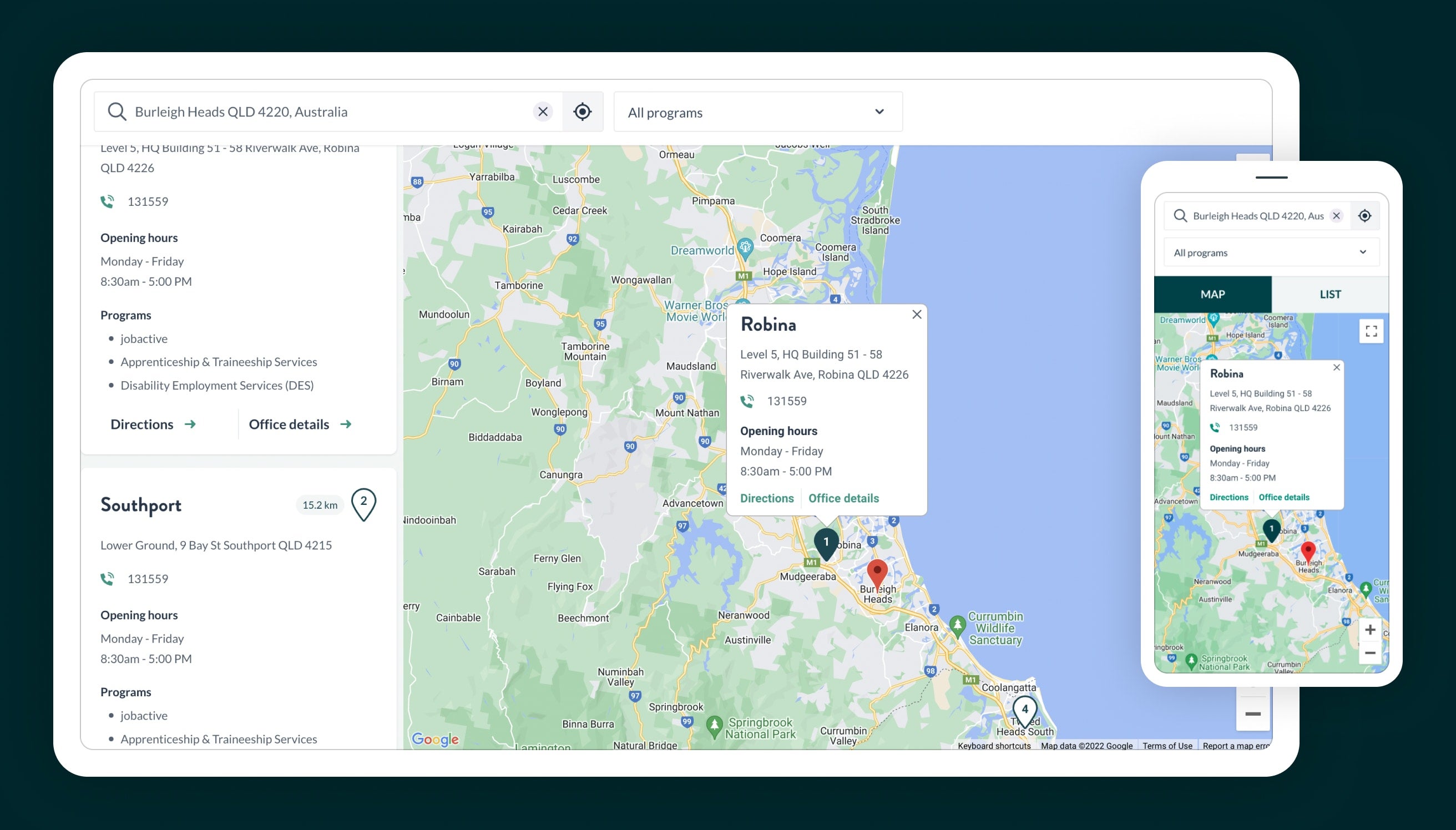 Help users find their way to you by plotting your physical office locations on a map. We implemented an 'Office finder' for Sarina Russo, which displays the distance in kilometres between the office and the user's location, and provides important contact office details - all without leaving the website.