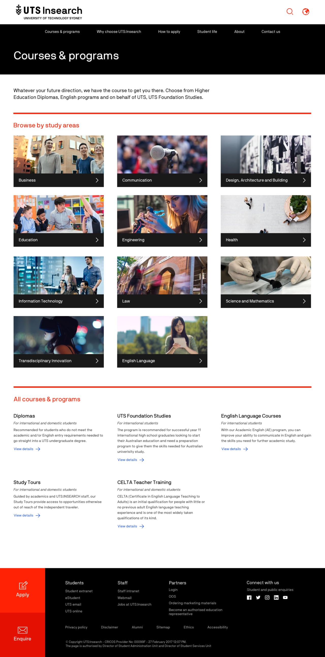 The website was launched to specification and with the required features. In the multi-million dollar student recruitment field, the UTS Insearch stands proudly alongside it's main campus offering. It's an effective website backed by a Kentico CMS that makes maintaining the level of information required for successful recruitment and retention simple.
